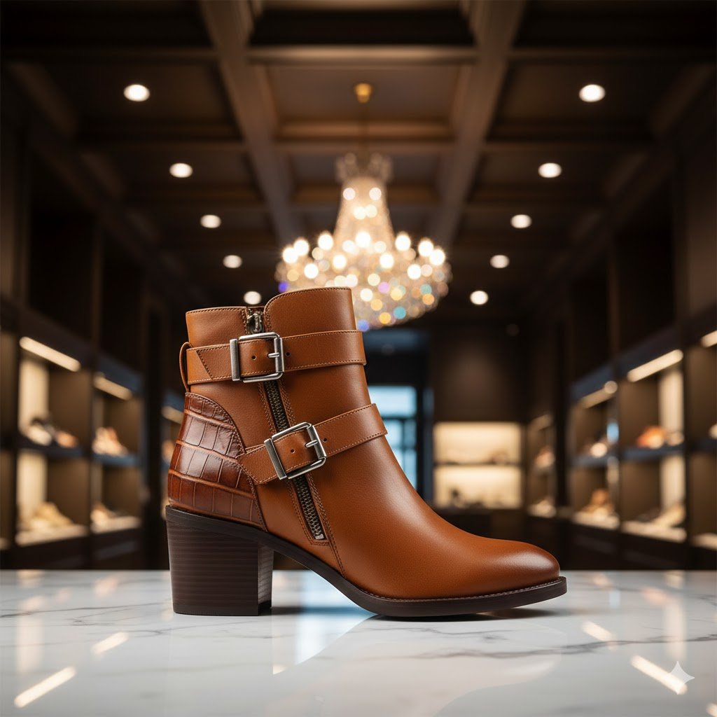 بوت كاحل يجمع بين العصرية والجاذبية. مصنوع من جلد بني دافئ مع تفاصيل حزامين بإبزيم معدني. مثالي لإضافة لمسة أنيقة وعملية لإطلالاتك اليومية.